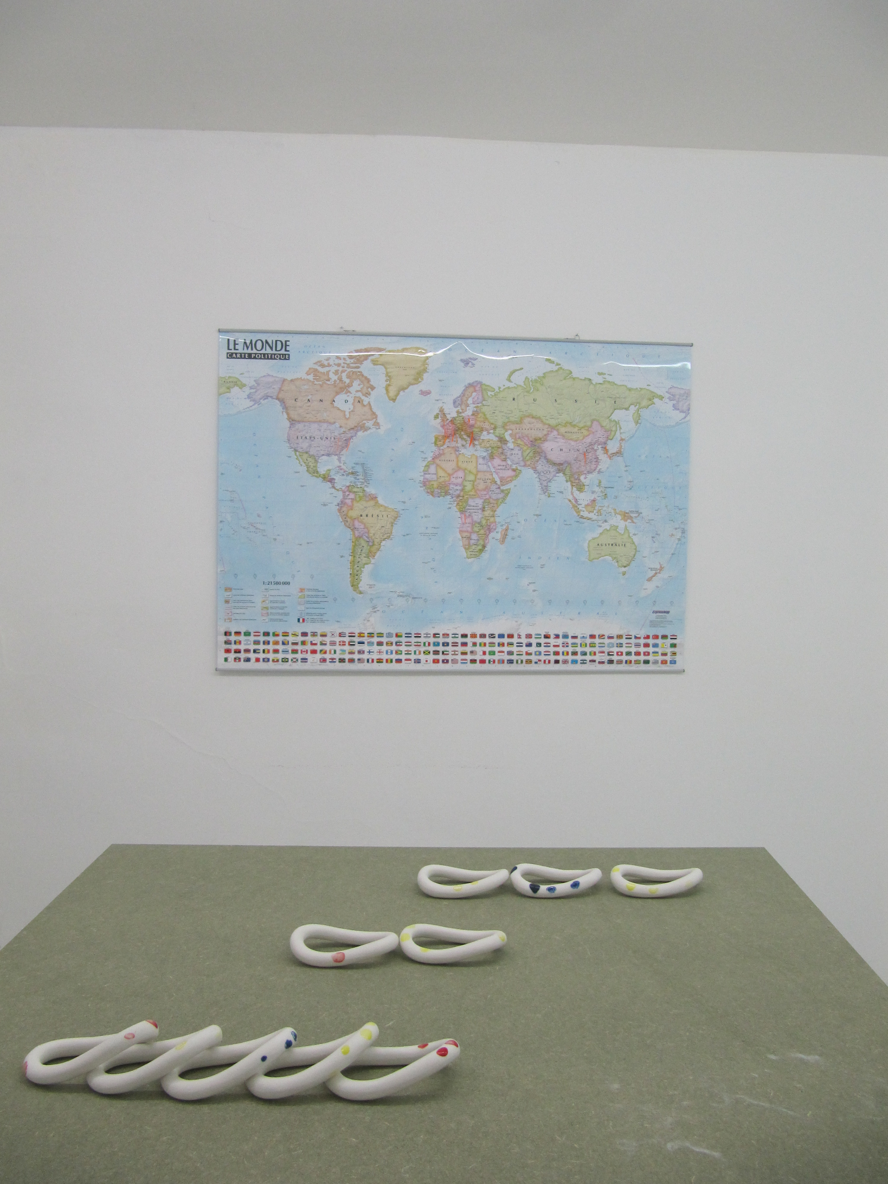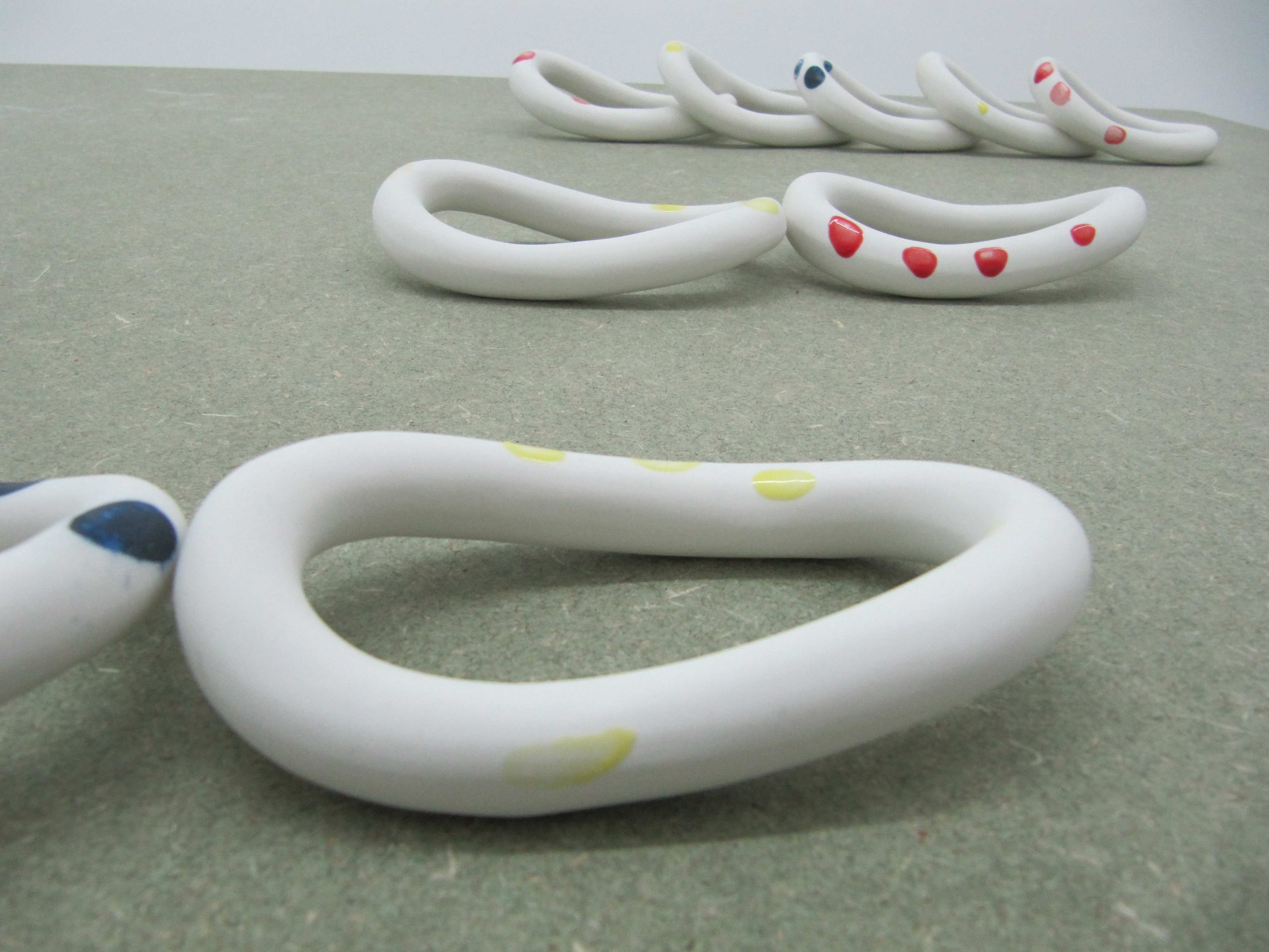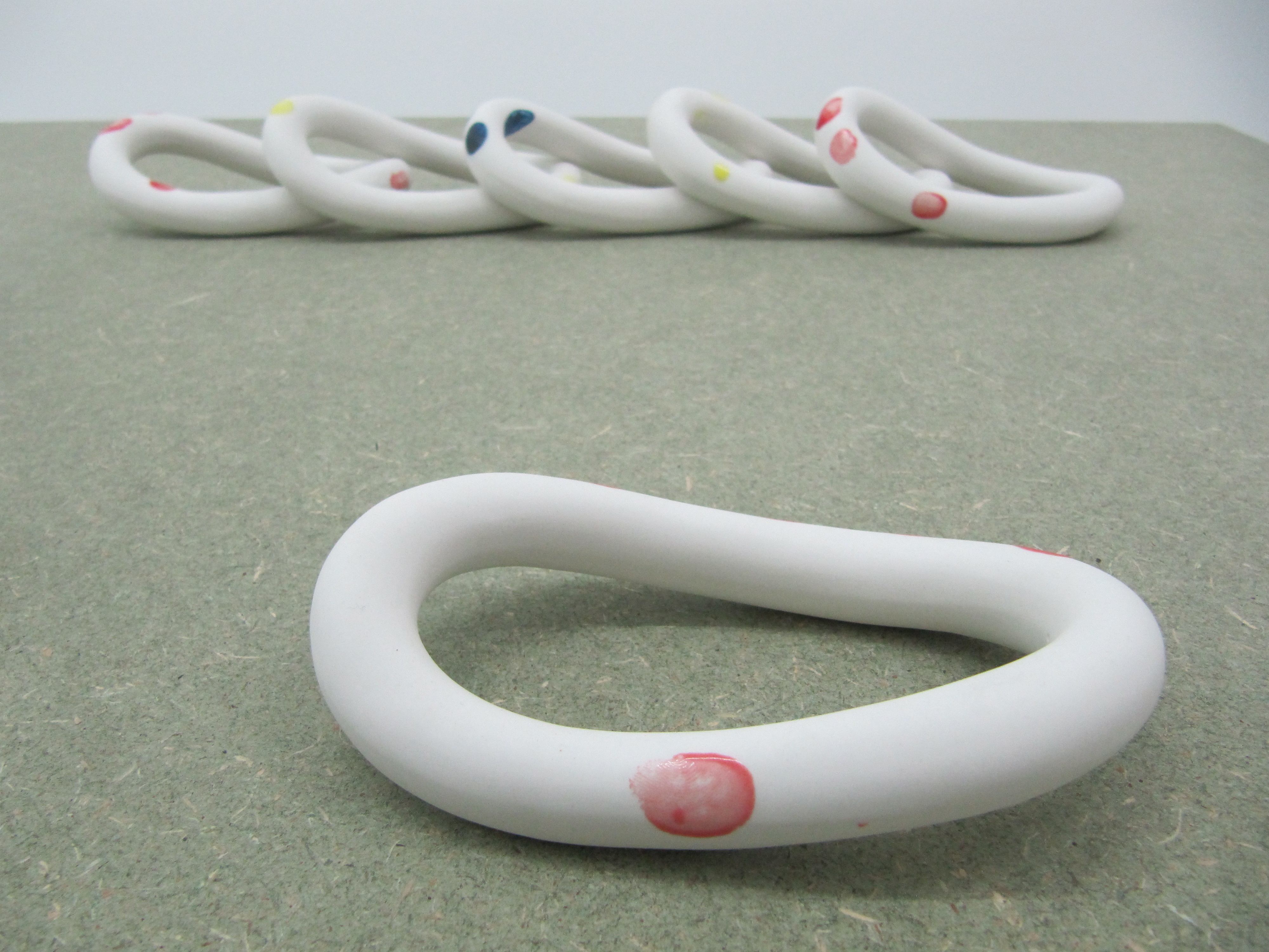 «And & e» est un projet de maillon en porcelaine de 12 x 6 cm. Seul un maillon unique et fermé est fabriqué en 3 séries de 8 exemplaires et deux épreuves d’artistes chacune. Les maillons sont en porcelaine biscuitée mais gardent une intervention de la main par l’apport d’un émaillage brillant bleu, jaune et rouge (selon la série) que je viens appliquer au doigt sur la pièce, y laissant mes empreintes digitales. La porcelaine me sert à questionner cette notion de lien et de solidité apportée par la matière de la forme initiale, c’est à dire le métal. La fragilité qui émane de la porcelaine suggère celle des liens créés actuellement entre les Hommes. La forme déjà existante, bien qu’épurée de tout ornement, garde en mémoire l’idée d’attache, d’une forme simple donnant une utilité à un ensemble. La multiplicité de ce maillon me permettrait d’enclencher un projet d’échange à portée internationale. En effet, les maillons seront envoyés dans différents pays (Chine, Italie, États-Unis, Suisse, Serbie, Pologne, Corée, Belgique, Afrique…) Cette sculpture est un objet d’unification entre différentes personnes tout autour du globe. Les maillons ne servent plus d’éléments pour créer les liens d’une chaîne mais bien un support à un lien humain, fragile et apatride au monde.