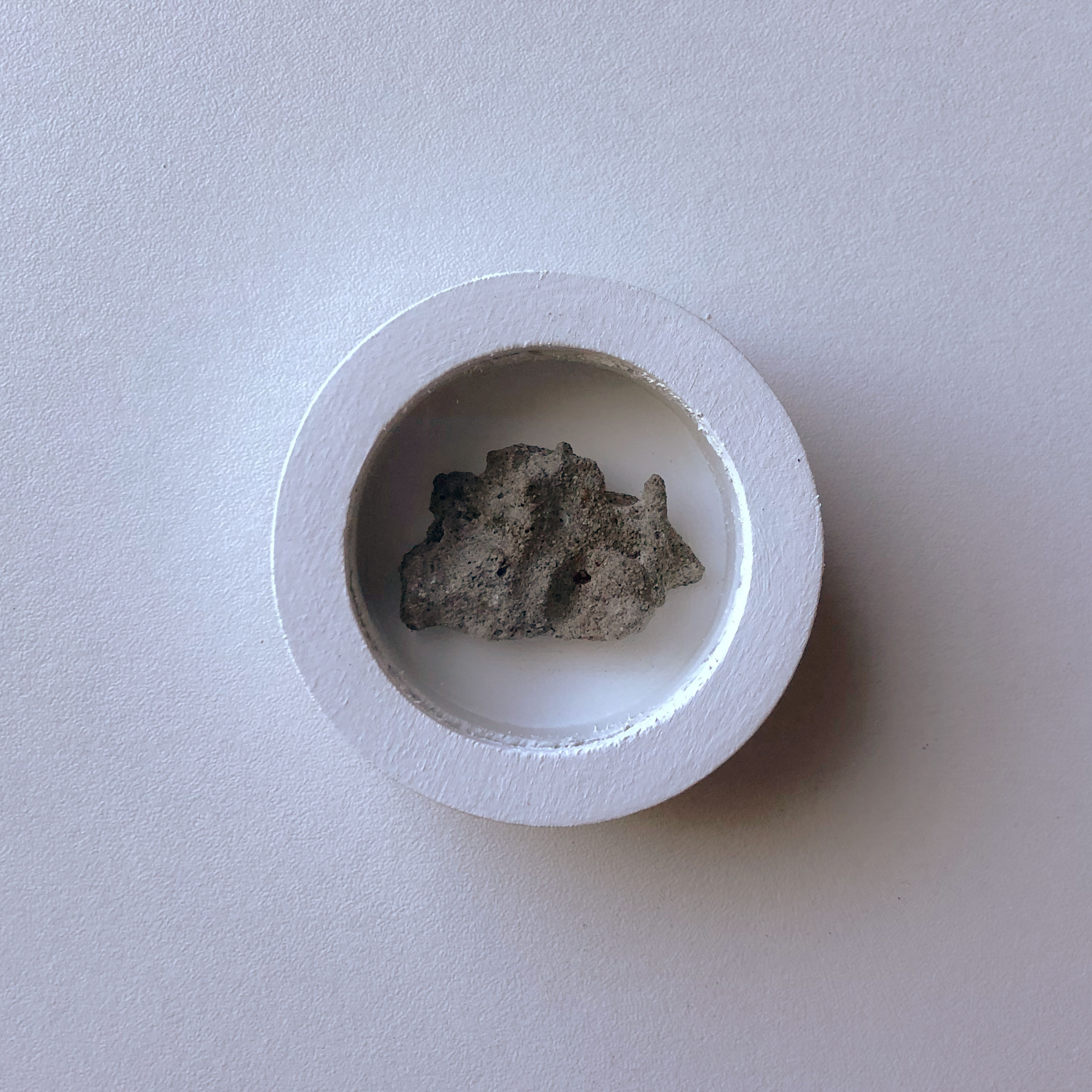 Le centre de la pièce, qui devrait contenir le mécanisme des aiguilles, est ici remplacé par un morceau de bâtiment glané. Sorte de relique d’un présent, elle deviendra à long terme, un morceau de mémoire du lieu disparu.