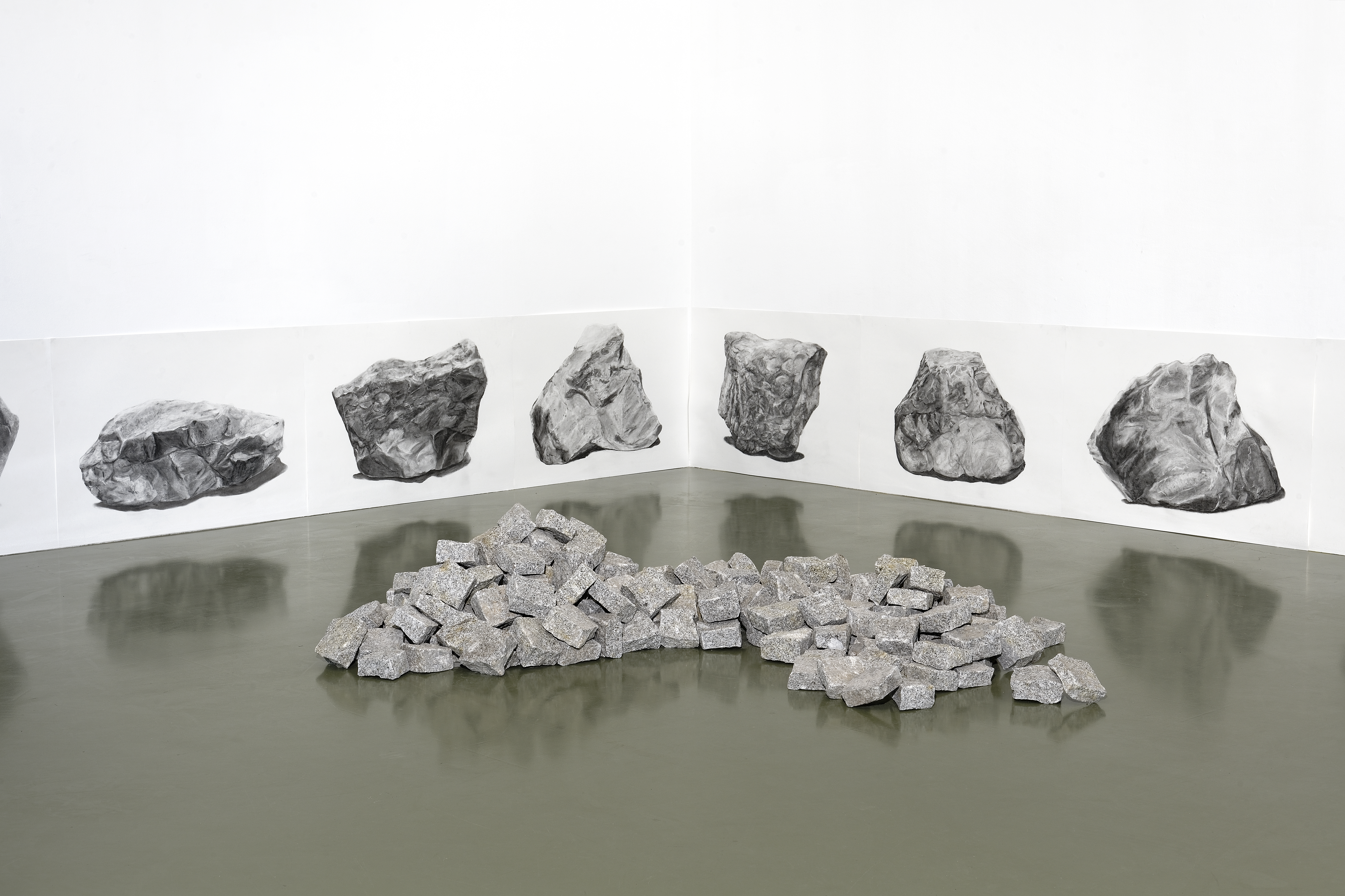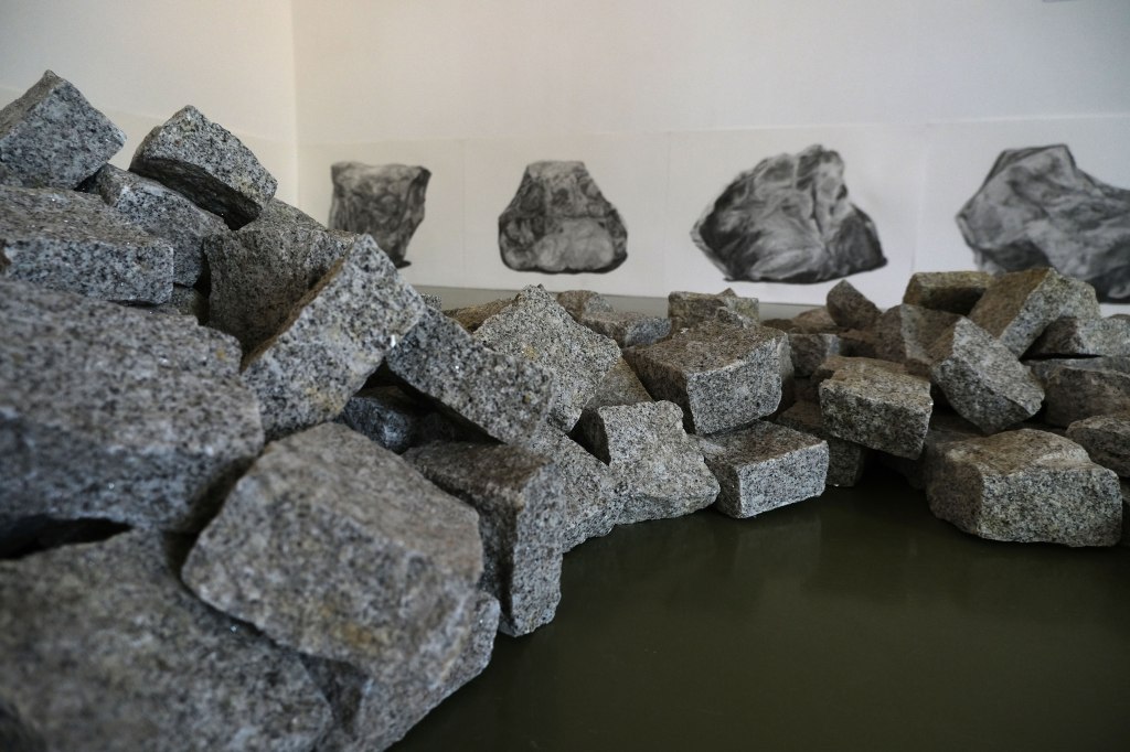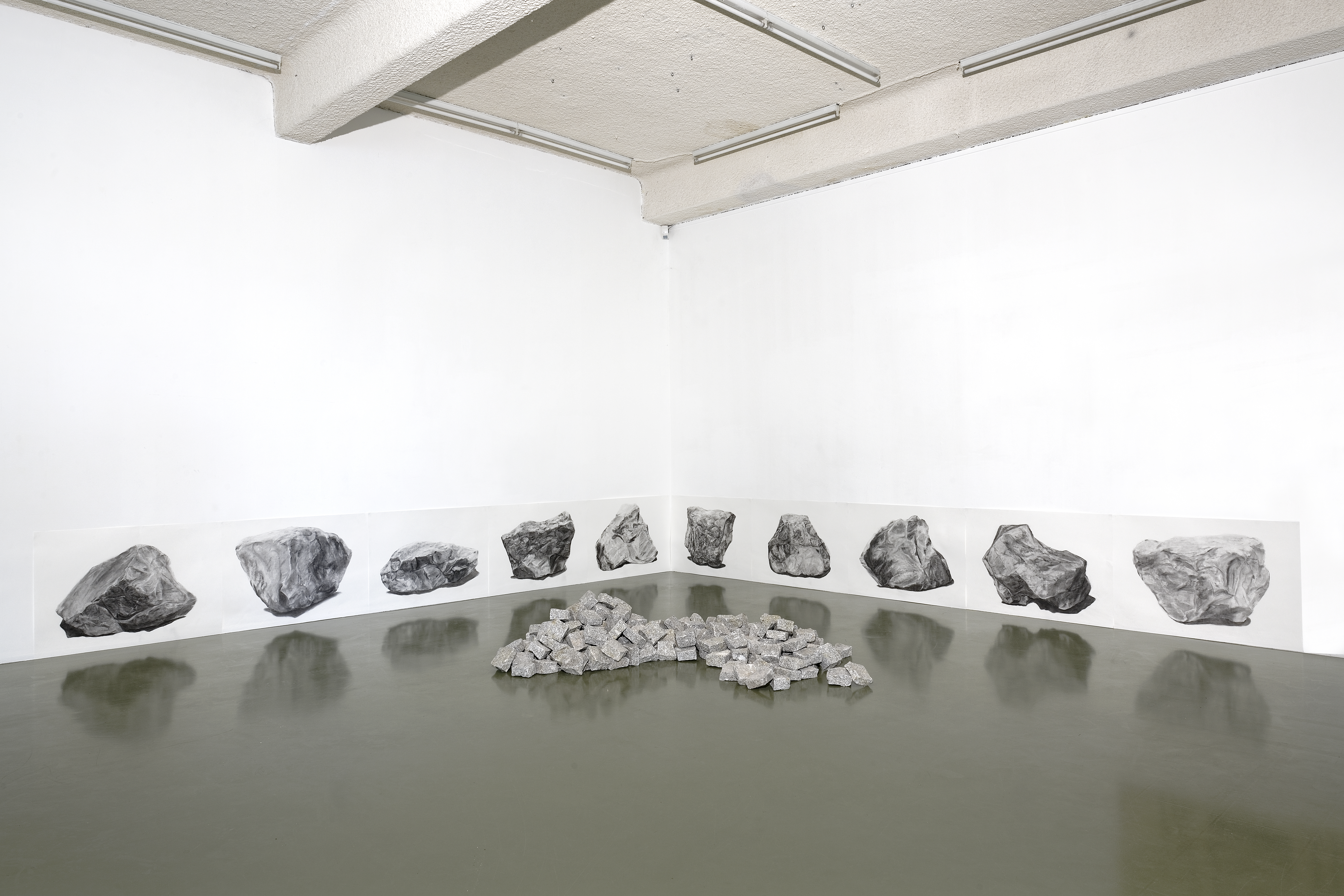 10 dessins au fusain sur papier aquarelle 200g, 75 x 105 cm chaque, tas de 240 pavés (11 x 9 x 5 cm) de granit gris (3m², 321 kg), installation dimension variable.
