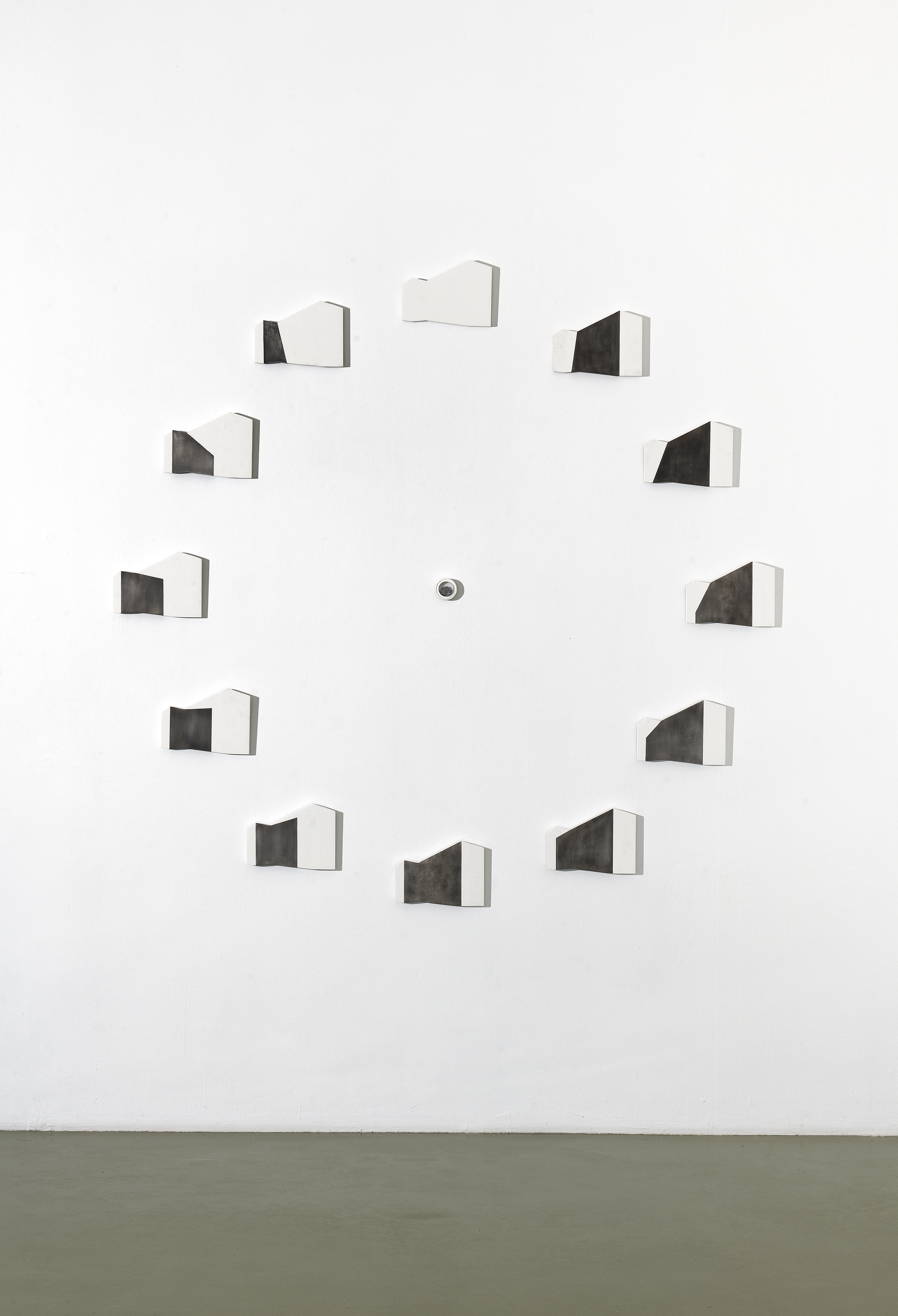 Chaque forme en bois peint qui compose ce cadran sans aiguilles, est marquée par l’ombre du soleil du mois d’avril. L’ombre, est reportée minutieusement, heure par heure, en fonction de la direction du soleil, pour former une journée complète. Les ombres ne sont pas dessinées par un ajout de matière, mais par le dépôt de suie laissé par le brûlage du bois.
