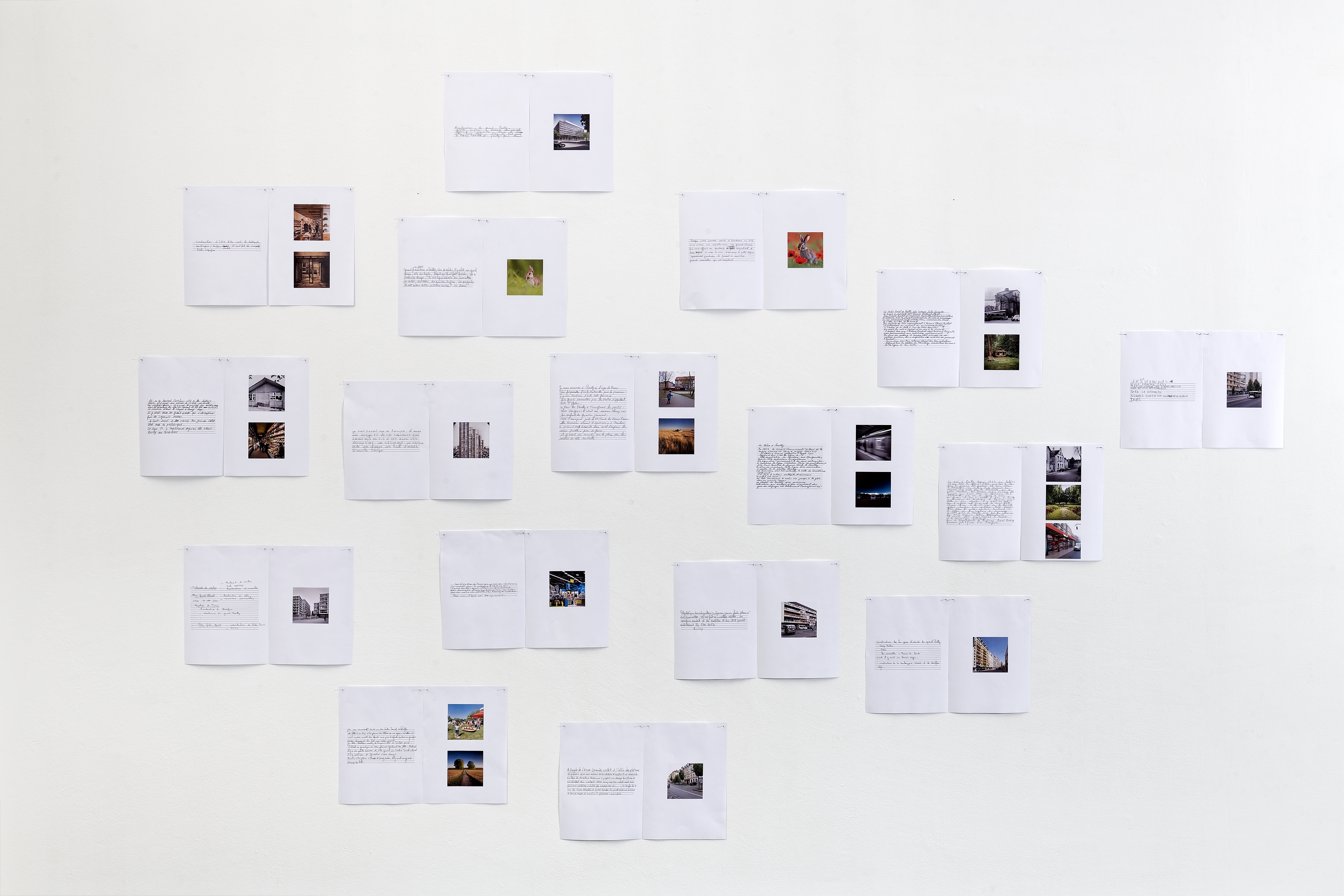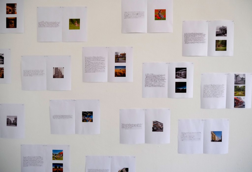 Souvenirs écrits des usagers du Centre Social de Parilly (Vénissieux), images générées par l’intelligence artificielle « Craiyon », 17 duos de feuilles 21 x 29,7 cm, installation : dimensions variable.