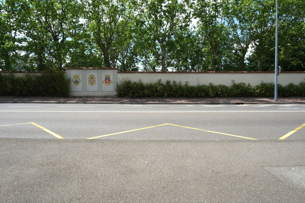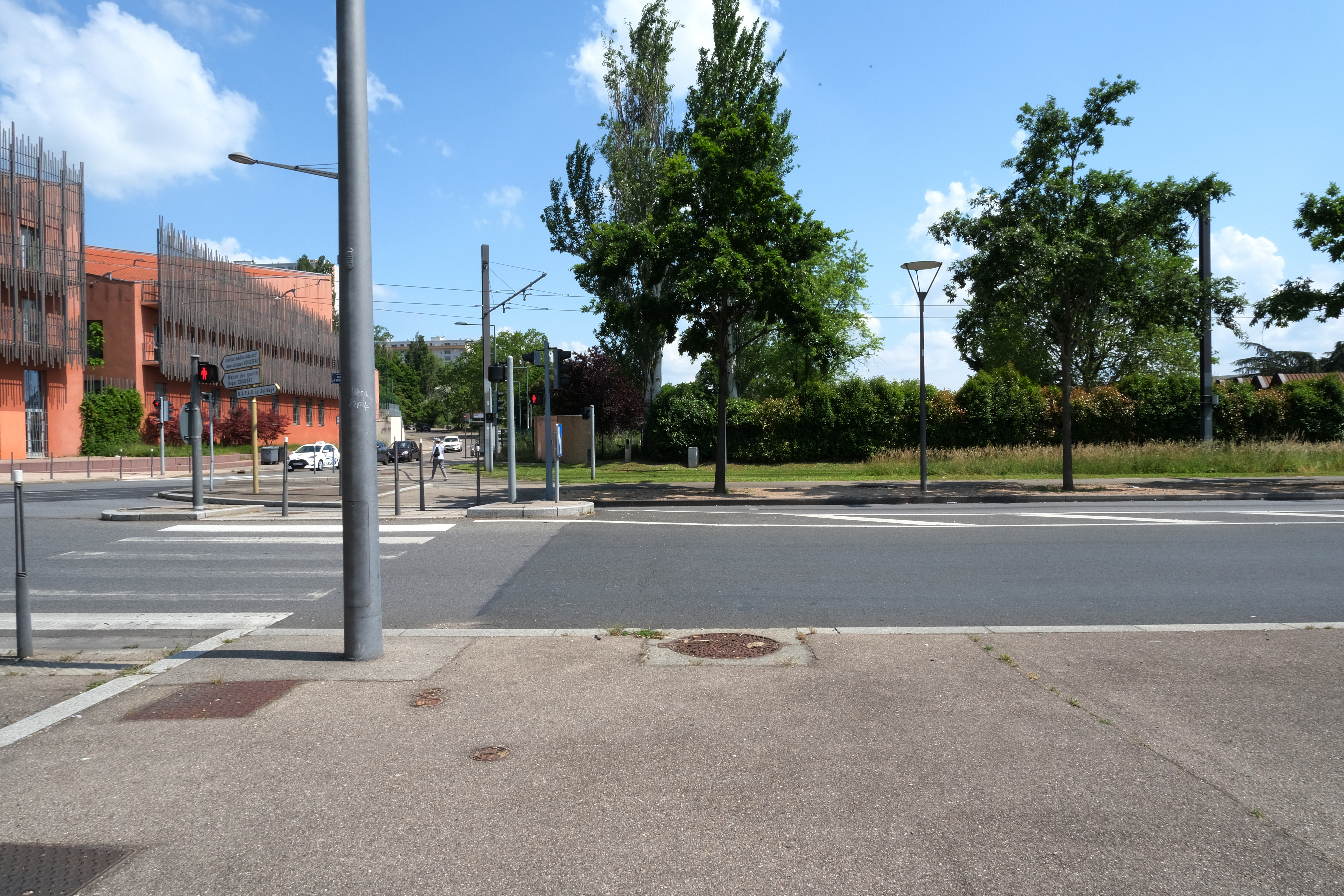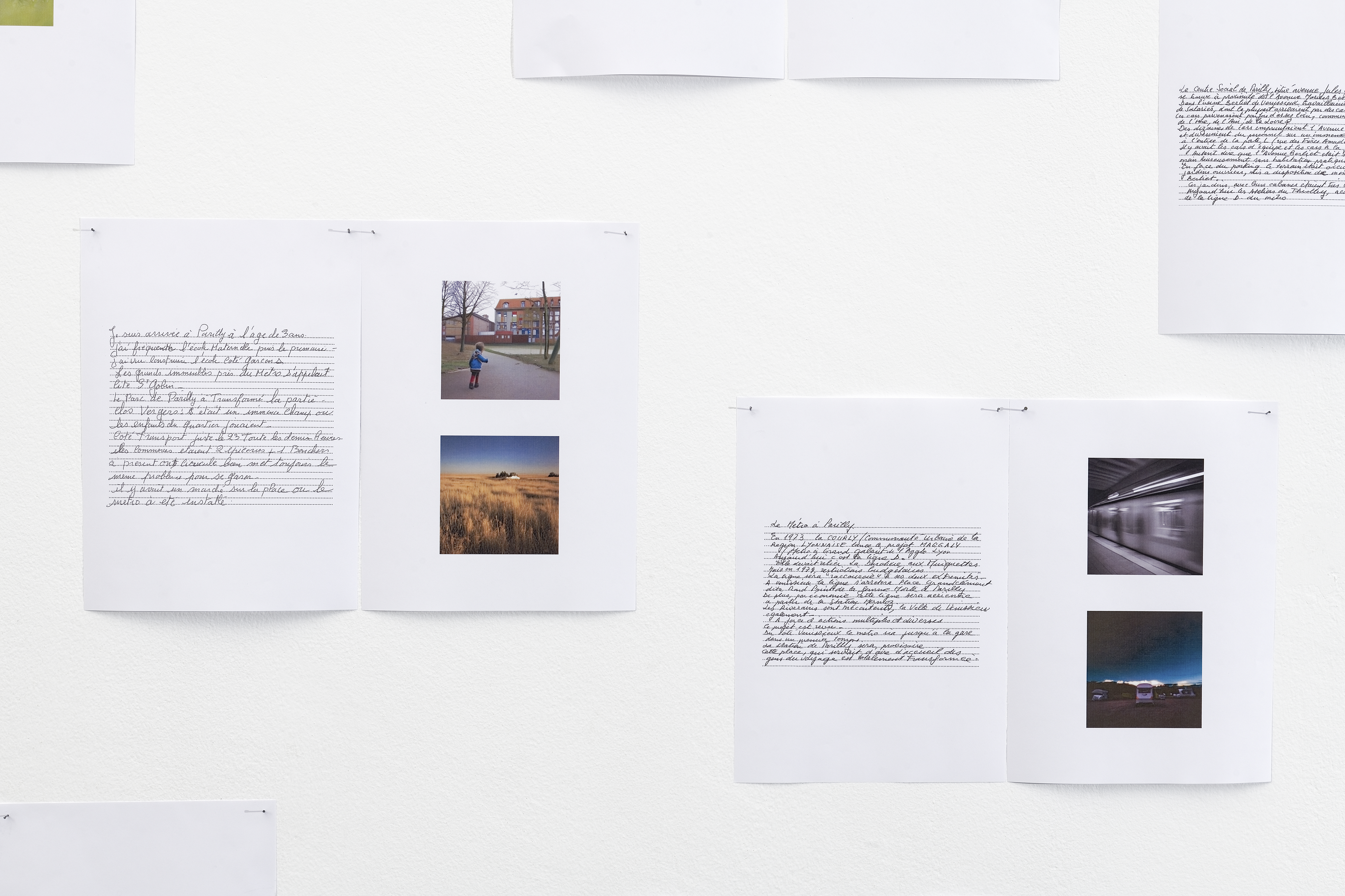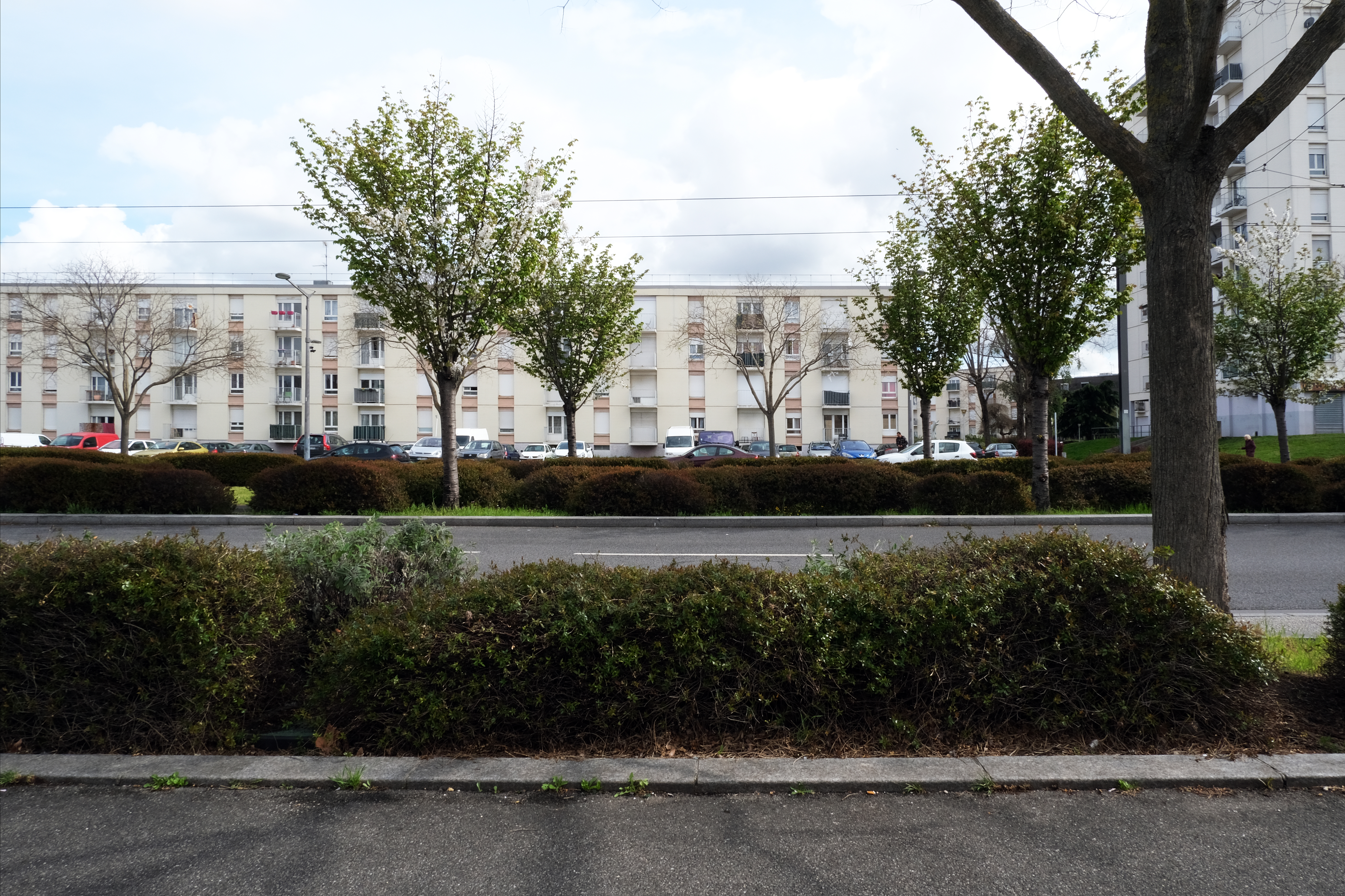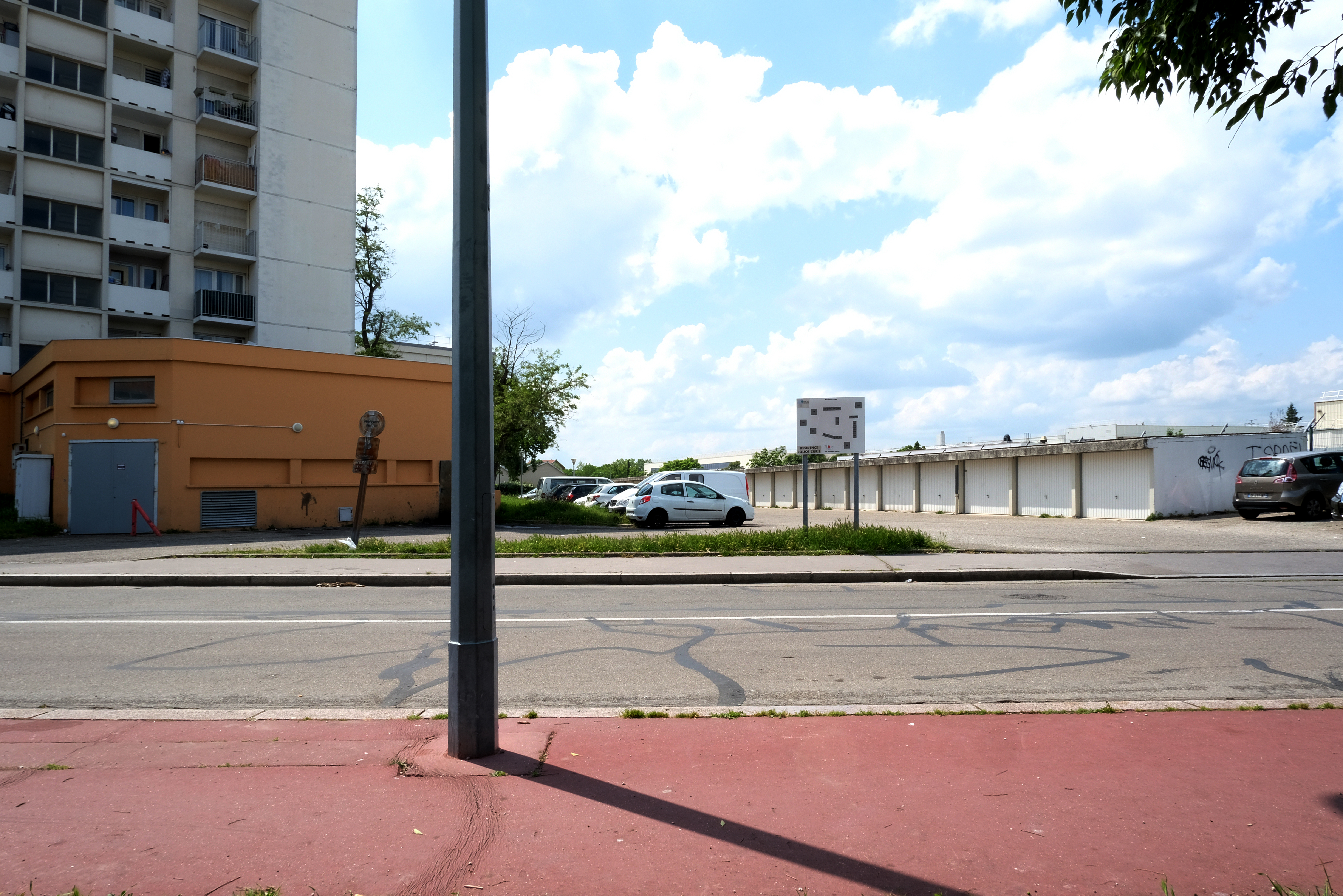 Assise sur chacun de ses bancs, appareil photo à l’œil, j’ai capté les paysages qui s’offraient à ma vue. Chaque photographie a une composition commune : une route bétonnée, un peu de verdure, un bâtiment et toujours, un poteau. Chacune des vues n’offre que très peu d’indices pour se situer : nous sommes dans un environnement citadin en France.