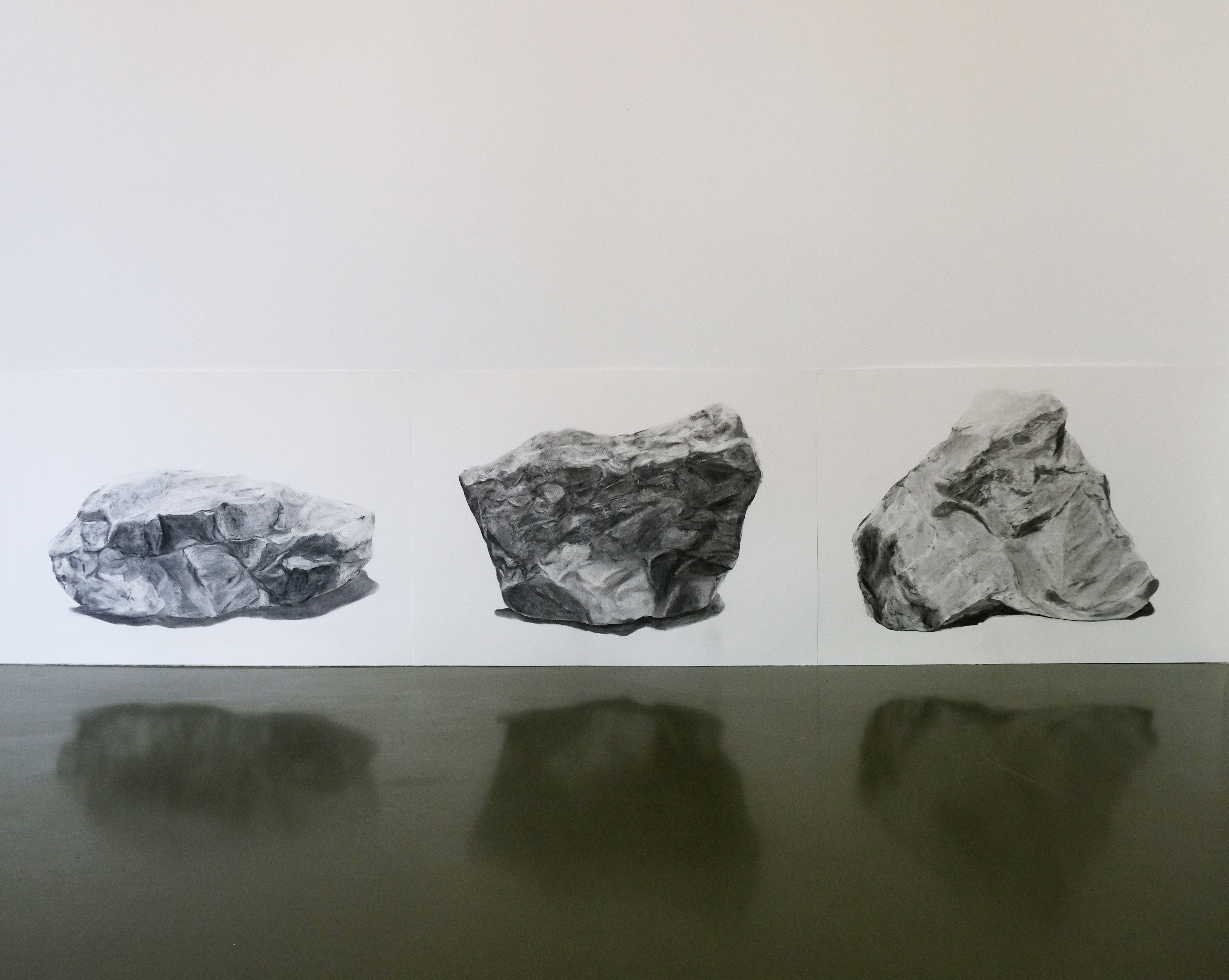 SAD/sad comme les pierres est une installation qui se compose de dessins de roches format 1/1 au fusain. Ces roches, décontextualisées de leurs espaces respectifs, prennent l’allure de petites montagnes à gravir. Le dessin au fusain fige ces figures d’autorité de manière classique, intangible, comme sorte de représentation du maintient de l’ordre urbain poussé à l’extrême.
