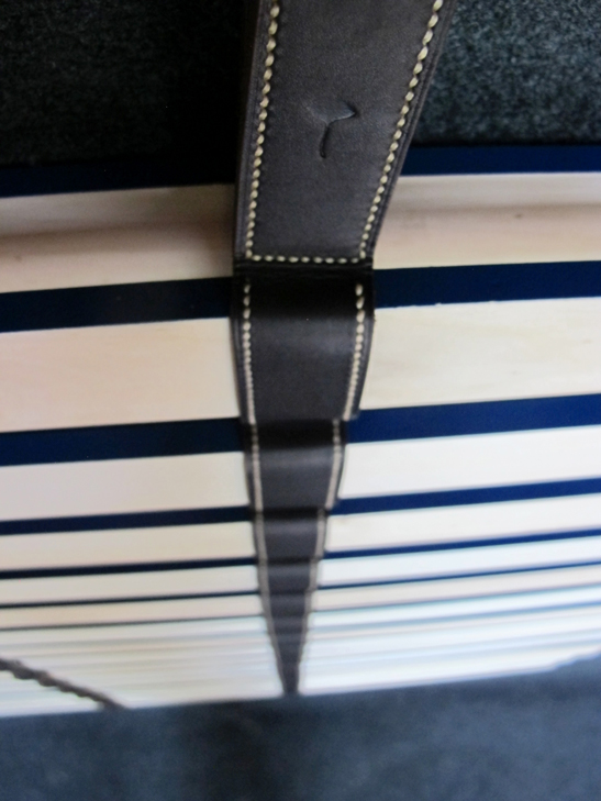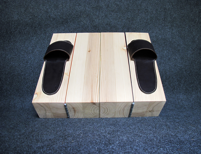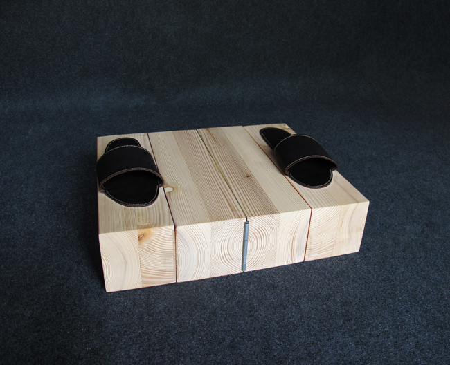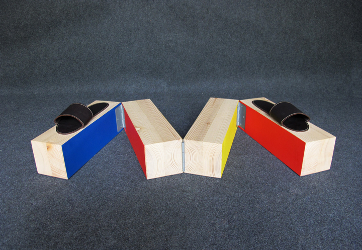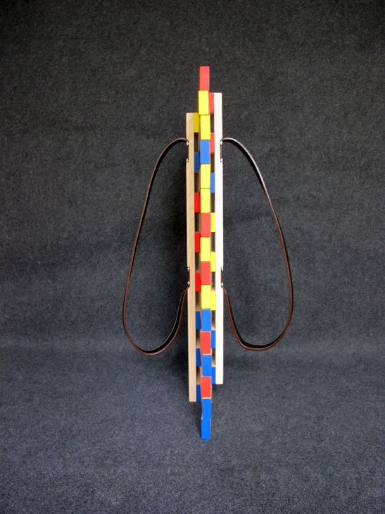 sapin, peinture acrylique, cuir cousu main, 47 x 40 x 20 cm