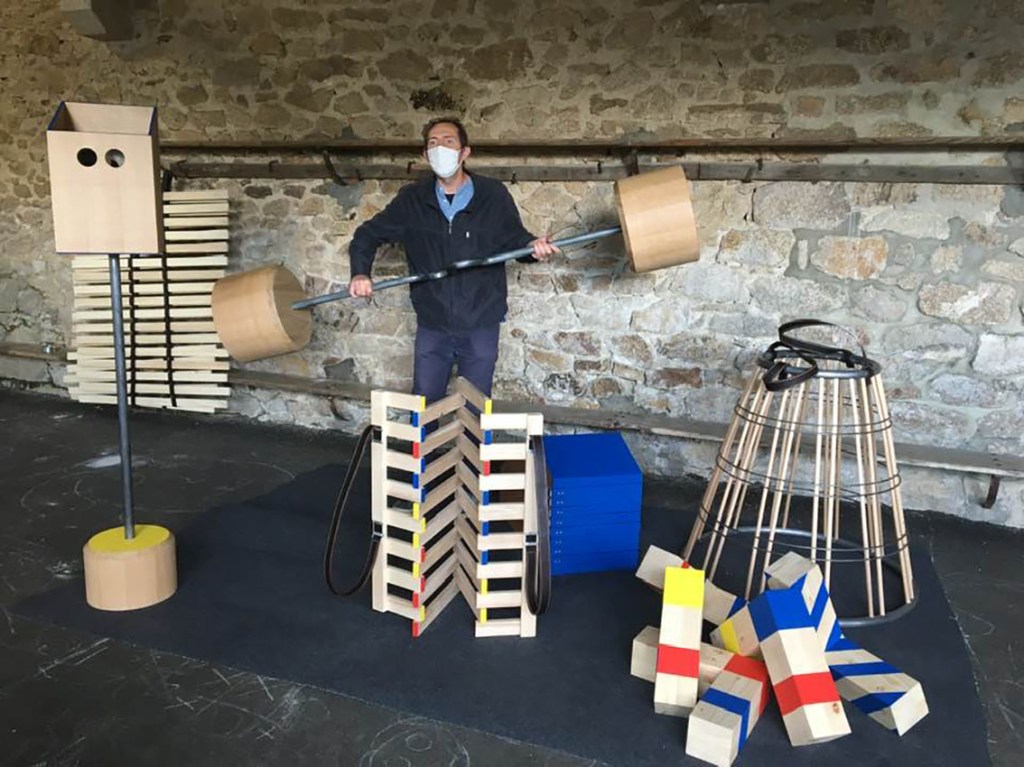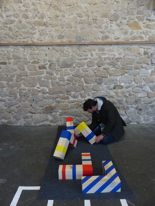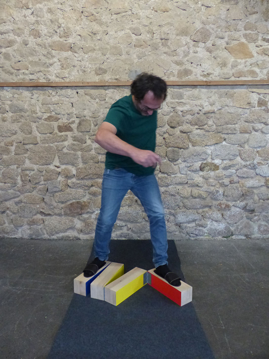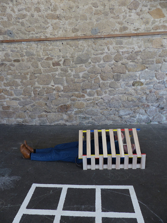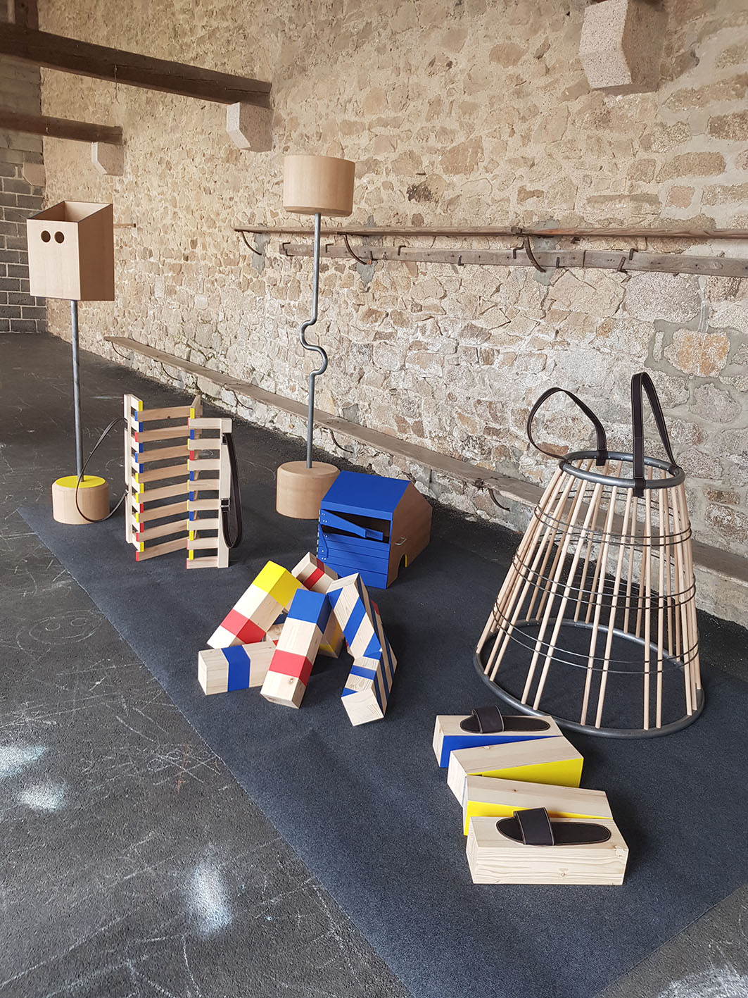«Étrangers à Saint-Sulpice-Laurière, nous sommes accueillis en pays inconnu ; si, en arrivant, nous ne savons ce que nous allons faire, nous sommes certains de vouloir travailler ensemble. Escalier chausse-trappe, bloc sanitaire en fuste, reproduction quasi grandeur nature d’un paysage exotique, poutres apparentes et barres de métro sur la porte, le chalet saint-sulpicien nous abritera ici le temps de « La croisière de l’art ». Cette bâtisse en bois a été réalisée lors d’une collaboration entre l’École Boule de Paris et Lycée des Métiers du Bâtiment de Felletin (construite pour un projet pédagogique par des lycées d’enseignements professionnels limousins). De la construction alambiquée (du fait des exercices juxtaposés), nous avons extrait des travaux d’étudiants pour agencer nos propres réalisations ; comme le gîte, La bavarde, Le tartan Saint-sulpicien, L’haltèropéde, Chaussé-glissé, Cinq minutes de vacance, Morri(s)kado, Le canap’a dos, La cartouchière à jalousie, seront, Selon l’humeur, des œuvres praticables. À échelle humaine, les pièces sont fabriquées en bois, métal et cuir, en collaboration avec des artisans du territoire. Les couleurs (le bleu, le jaune et le rouge) viennent souligner l’ambivalence plastique des objets imaginés. Pas vraiment utilitaires ni commodes, jupe, chaussures, sac à dos, et autres coiffes feront une occasion de séance d’essayage par les habitants présents le 26 septembre où chacun prendra son attitude propre avec les sculptures. Une série de photographies des expérimentations deviendra le répertoire de ces micro architectures portatives.»