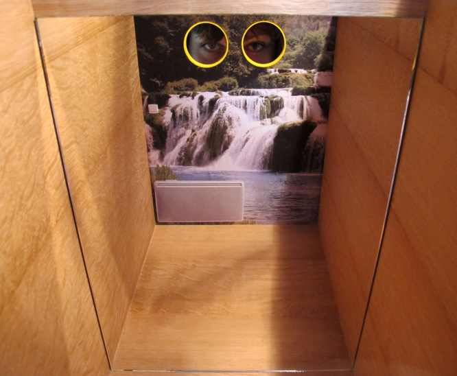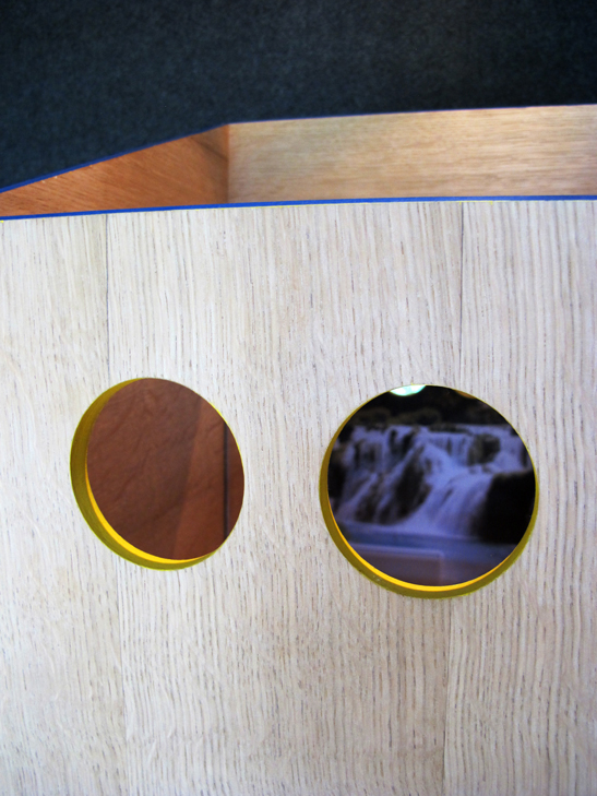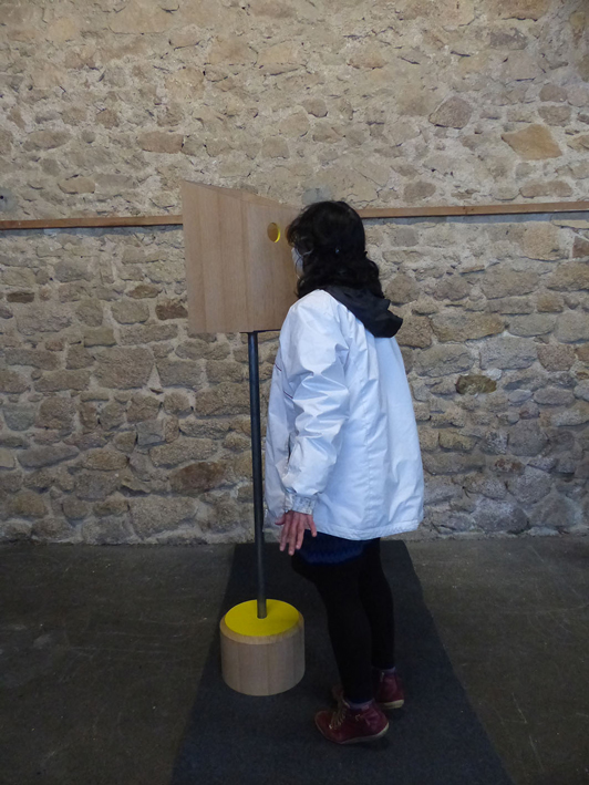 placage chêne, peinture acrylique, photographie, miroir, métal, 173 x 30 x 31 cm